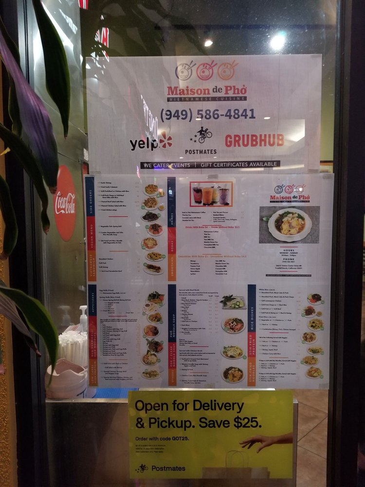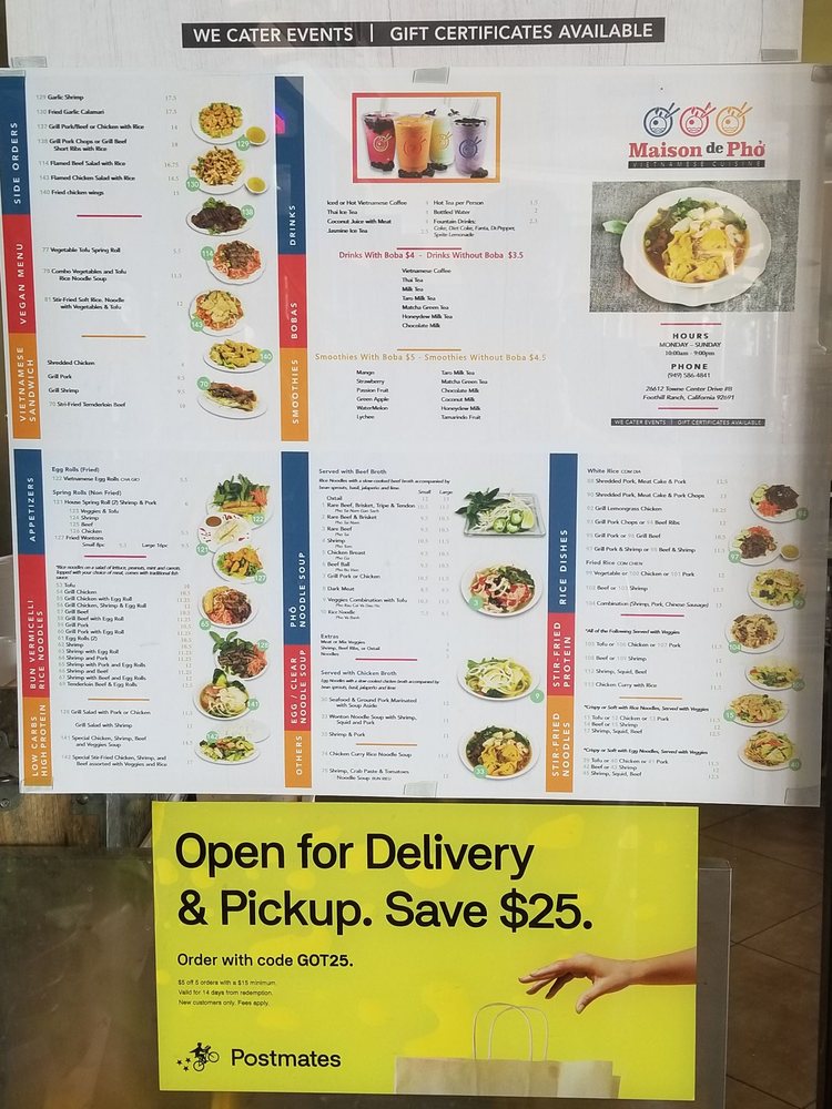 Maison De Pho is a Vietnamese restaurant located in Foothill Ranch, CA. The menu offers a variety of appetizers like Vietnamese Egg Rolls and House Spring Rolls, as well as an extensive selection of Pho Noodle Soups and Egg and Clear Noodle Soups. Customers have raved about the flavorful dishes, with one reviewer praising the short rib beef plate and another enjoying the rare beef pho and Vietnamese egg rolls. While some customers found the food to be okay, others appreciated the quick preparation and delivery. Overall, Maison De Pho is known for its delicious and authentic Vietnamese cuisine, making it a must-try for pho lovers in the area.